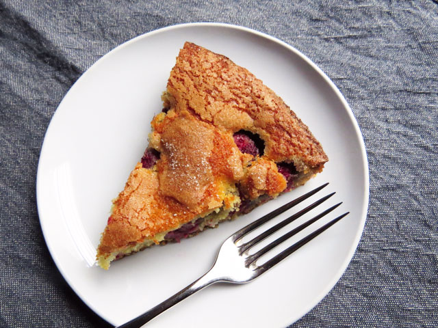 - Add the flour mixture in three batches, alternating with the buttermilk. Pour into prepared pan, smoothing the top of the batter. Scatter the raspberries on top of batter, and sprinkle remaining 1 1/2 tablespoons of sugar. Bake for 20 to 25 minutes, until golden brown, testing with a toothpick. Let cool in pan for 10 minutes, turn out and let cool on a wire rack.