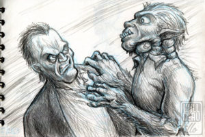 In this week’s edition of IT CAME FROM THE SKETCHBOOK I’m featuring some of my couch doodles of monsters doing what they do when they get together which is not getting along. Monsters usually don’t play nicely with one another which is part of their appeal. Nobody is going to pay to watch a misshapen manmade monstrosity discuss sports or politics over a couple of beers with a scion of Satan. It’s like paying to watch professional wrestlers assemble Ikea furniture or gymnasts balancing their checkbooks.