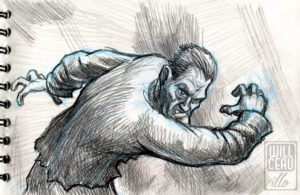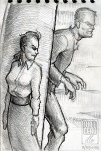 As I doodle and flesh out these scenes ideas bubble up from the pages and I ask myself questions about these creatures. How quickly do werewolves regenerate from mortal wounds? Are vampires always corporeal or just during the day? Are they like wraiths at night? The Frankenstein monster has been shot and survived in some of the movies. How bulletproof is he? Is he immortal or has he always benefitted from a new mad doctor who could never leave well enough alone?