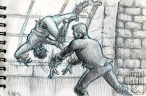 I grab what is handy. Before digital reproduction, people would roughly sketch in non-repro blue because it wouldn’t show up on camera. Ordinarily if I inked these drawings like a comic illustrator would, I would try to erase as much of the black pencil as I could. The camera would read the black ink and not the blue pencil. Now that doesn’t matter so I grab what is handy.