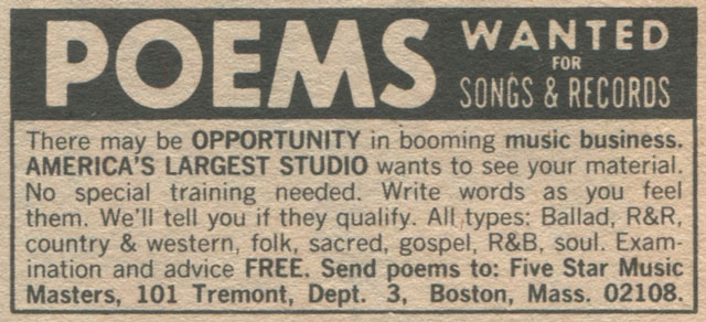 I was never a fan of poetry so I can’t imagine soliciting the amateur efforts of scribes across the continental United States and Canada. Somebody at the mail drop was going to have to read these submissions whether they were typewritten or scrawled by hand in pencil, ink or crayon. This person or persons would have had to weather a stormy sea of misspellings and all sorts of grammatical tragedies all in search of a ditty. Obviously, there had to be a catch, but there has to be an easier way to make money. It sounds like a position for a masochist or a job assigned by a fairly sadistic boss. I imagine they would go through a temp agency because who would sign up for something like this?