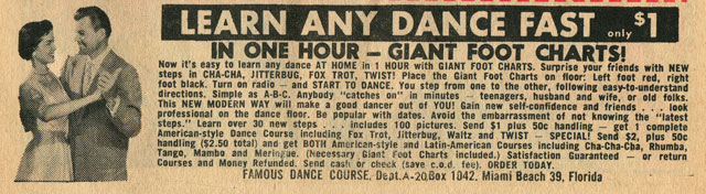 This advertisement which I had never seen before I cracked open an ancient comic my buddy Bill scored for me from a flea market promised that anybody could learn any dance FAST through the use of GIANT FLOOR CHARTS. All you needed was a dollar (plus 50¢ shipping and handling) and in one hour, you could be ruling the dance floor and impressing everyone with your smooth moves! Throw in another buck and receive BOTH the American-style and Latin-American Courses! SATISFACTION GUARANTEED!