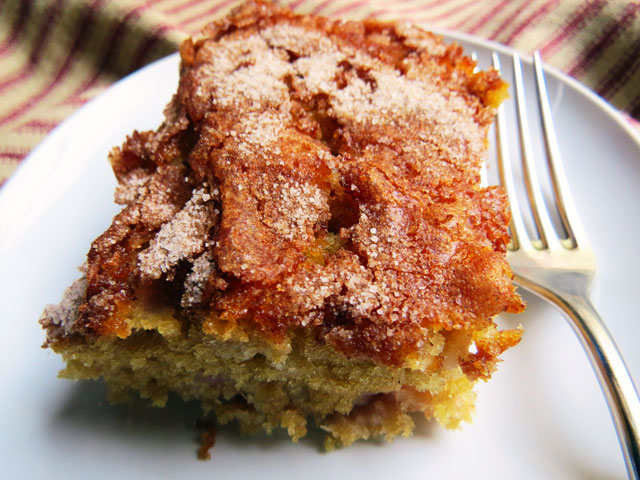 - In a small bowl, whisk the granulated sugar and cinnamon, sprinkle on top of batter.