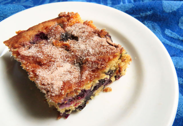 This is a wonderful cake – it’s studded with blueberries, moist, with a cinnamon sugar topping. Perfect for a holiday picnic!