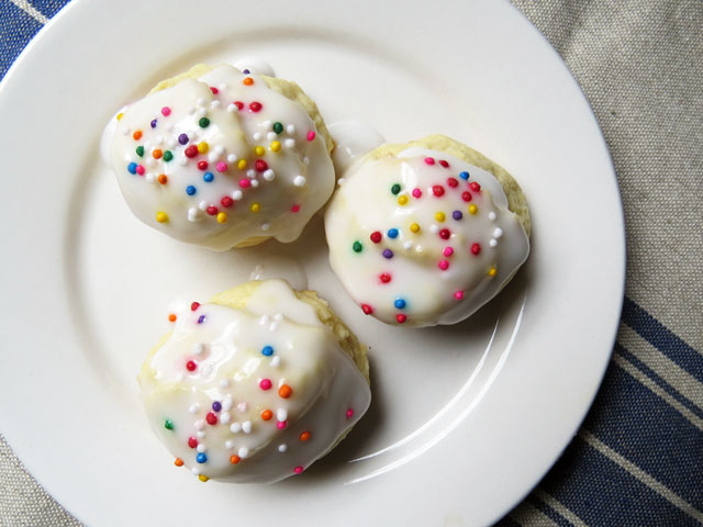 - In a small bowl, whisk the confectioners sugar, anise extract, and milk. Dip 3 or 4 cookies at a time in the icing, placing them back on the baking rack, and sprinkle with nonpareils.