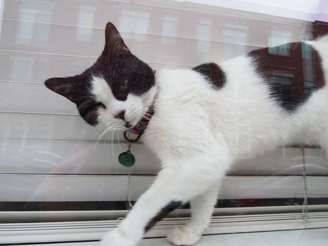 We see this cat frequently. His name (on the tag) is Panda and he seems very affectionate!
