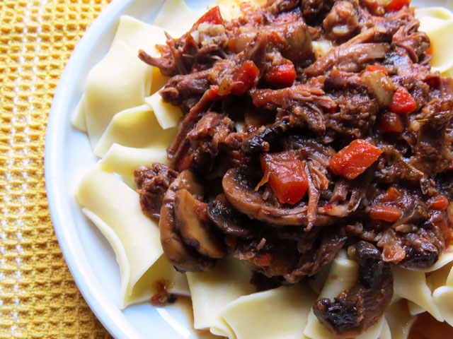 - Remove from oven and serve over egg noodles or soft polenta (recipe below). Serves 4.