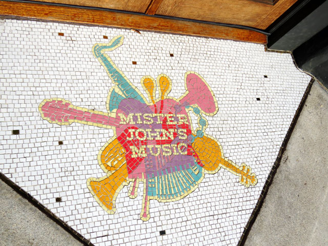 We’re revisiting a tiled entryway from an old post in 2018 that’s been redone. As you can see, this one was in rough shape. I haven’t been able to figure out what business this was. Anyway, flash forward to 2024, and Mr. John’s Music School took over the building and commissioned a new business tiled entryway! Bravo!
