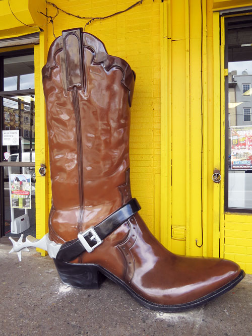 Big boot outside of an unlikely Western wear store in the Italian Market.