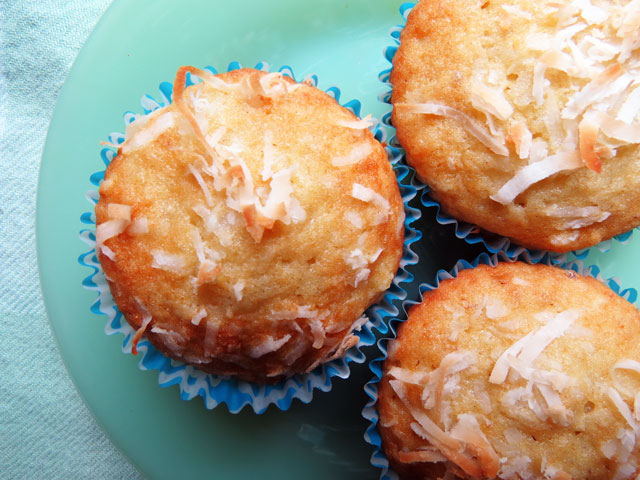- In a small bowl, whisk the flour, baking powder, baking soda, and salt. Add to the butter/sugar mixture until combined. Fold in the coconut.