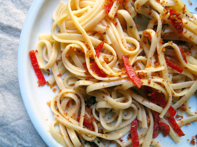 - Transfer the cooked linguine into sauté pan, adding a bit more lemon juice and pasta water if needed. Add parmesan cheese, and toss. Serve in 4 bowls and top with the pangrattato and more parmesan.