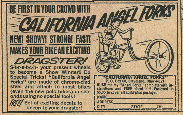 The advertisement for California Angel Forks appeared in Chili No. 5 published by Marvel Comics in 1969. Chili was an obvious Archie knock-off in the era when comic companies published more than just costumed crime fighters. There were war, western, romance, detective, funny animal and a number of other comic book genres in addition to super-heroes all stuffed into spinning racks at newsstands and corner stores. If something was successful as Archie was, it spawned imitators. Publishers did whatever they could to separate kids from their pocket change. It’s amazing to think that the publisher, distributor and retailer were all able to draw a profit form a 15¢ purchase.