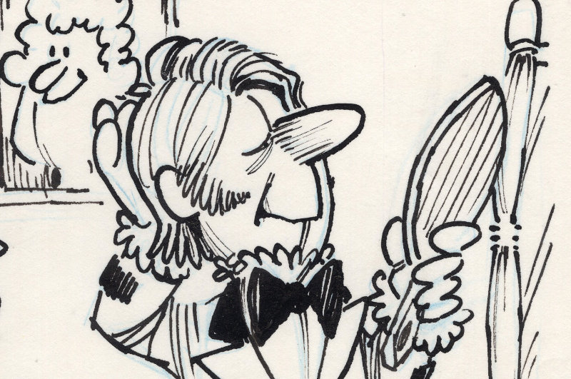 I don’t know how old the cartoon is or when it was published, but my guess is that it is from from the early ’70s. This was very much the style of a lot of cartoons and greeting cards at the time. The big bowtie, ruffled collar and cuffs, and the flared slacks were all very much of that era. Simple and clean line work. Politically incorrect. I had to have it.