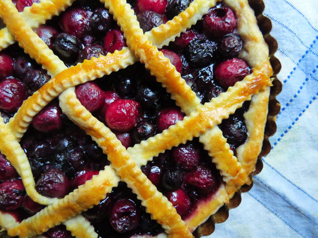 I’m still on a cherry kick, they’ve been plentiful in the market and gorgeous. Plus, the blueberries from New Jersey have been the size of marbles – so I combined the two into a tart.