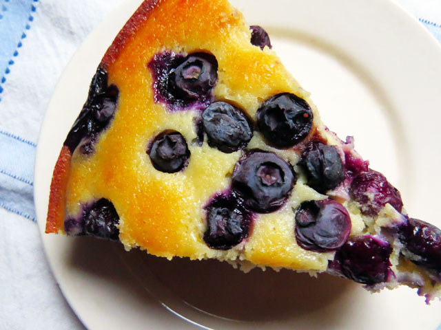 I had some ricotta leftover from a tomato tart I made over the weekend. Not wanting to waste it, The Boy and I decided to make a cake with some of the gorgeous blueberries we found in the market yesterday. Easy to put together, no icing needed!
