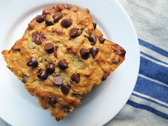 I love making bars because they’re no fuss, no muss. The fact that they’re made with bananas and oats makes it perfectly okay to have for breakfast. These peanut butter Oatmeal banana bars are moist and dense, and delicious with the addition of chocolate chips or you could add some chopped walnuts for crunch factor!