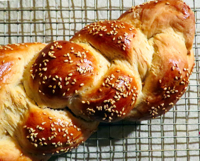 I’m in a bread baking rut, it was time to try something new. Braided breads have always appealed to me because they’re so pretty – and because I used to have hair down to my waist, I’ve got the braiding technique down pat. It produced a lovely loaf of bread which went perfectly with our spaghetti and meatballs!