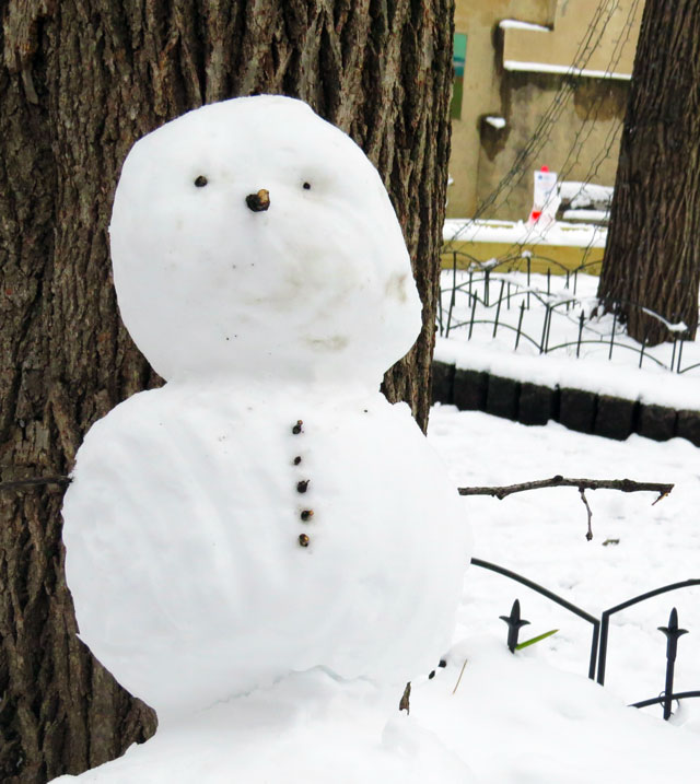 It began late in the afternoon, and by this morning we had enough snow for someone to craft this snowman sans corn cob pipe!