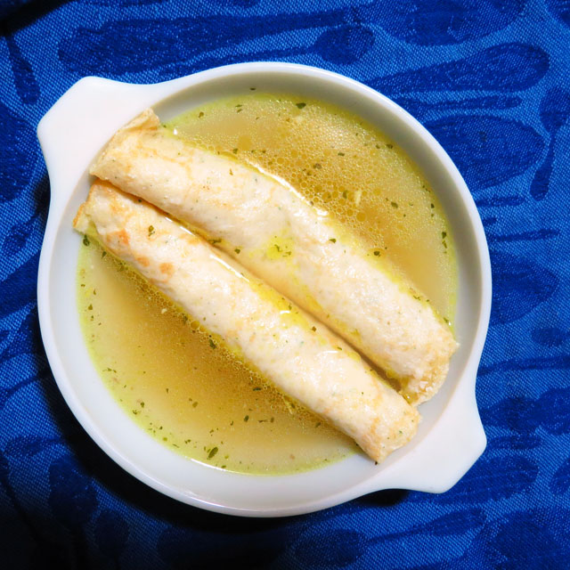 - Place 2 crêpes seam side down into a shallow bowl, ladle the hot broth over the crêpes.