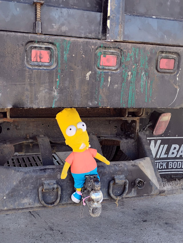 While I was out and about with The Boy, he spotted Homer and Marge’s kid perched on the hitch of a delivery truck. Must have left his skateboard at home.