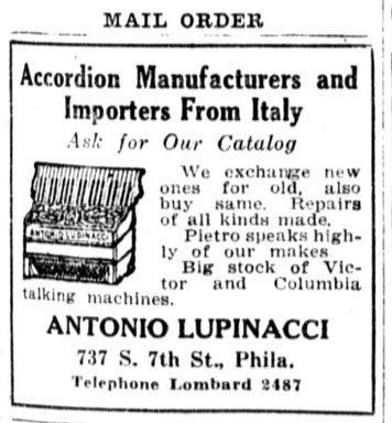 It’s been a while since I’ve posted a tiled entryway, I ran across this photo and thought I’d go with it. In the past, I’ve tried to research the various businesses usually coming up empty – however I struck gold with this one! Antonio Lupinacci bought, sold, and repaired accordions in his shop on South 7th Street – he even stocked “talking machines” also known as Victrolas. The ad below is from The Evening Public Ledger dated March 20, 1920.