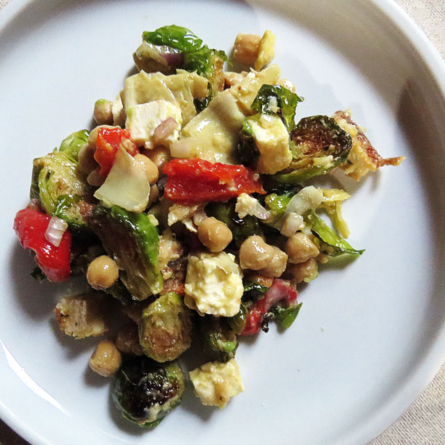 Last night’s dinner was Brussels sprouts, chickpeas, avocado, red roasted peppers, artichoke hearts, chicken, and feta cheese tossed in a garlicky lemon vinaigrette. It was a bowl of my favorite things, and the fellas liked it too! We’re big fans of Brussels sprouts, so it was great to have one more chance to serve them that’s not a fall/winter holiday. Let’s face it, corn on the cob and tomato season is right around the corner.