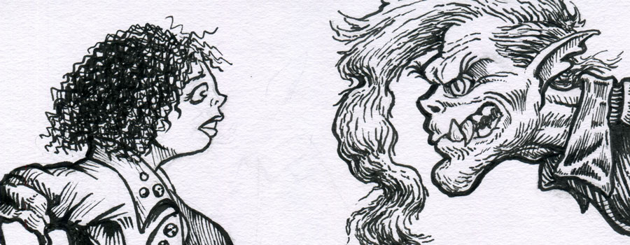 I’m back with It Came From the Sketchbook and once again my subjects are The Teenage Beast and the hapless punk rock gal. I’m piecing together a story via sketchbooks which is fun and much more effective than jotting down notes in notebooks. In the notebooks which I have been keeping for decades, I’ll waste a lot of time pondering a character’s motivation or background. With the sketchbooks, I get right to the heart of the matter which is the scene. You don’t need to know what the punk rock girl had for breakfast that morning or that she got dressed in her AMC Pacer in the parking lot of the punk club, but I have decades worth of notebooks filled with what I call “Look, Ma, I’m clever!” details that come to life and die unread in cheap composition books. The drawing says monster closes in on girl and the details tell the rest of the tale.
