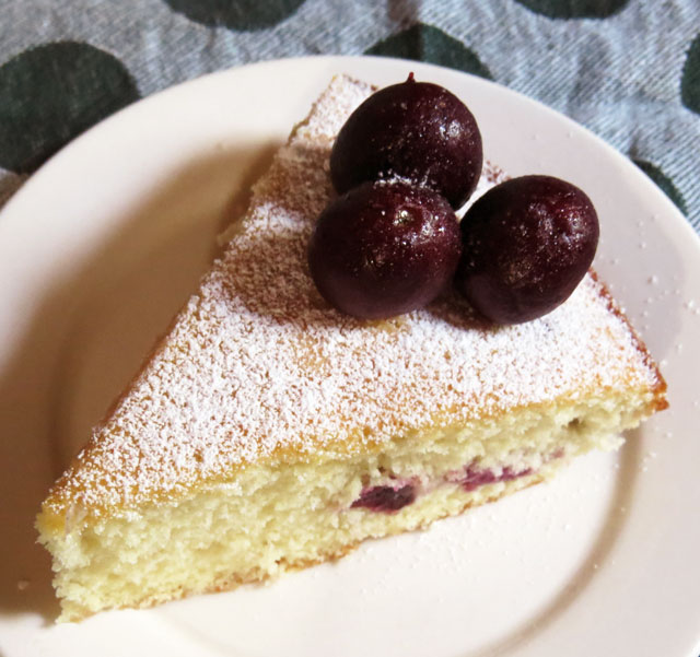 The market this weekend had an abundance of gorgeous cherries that I picked up to make fruit salad. Then I changed my mind, as I have been known to do and made a cake. Not just any cake, this cherry studded, light, spongy dreamy cake. So good that Joe helped himself to a second slice!