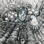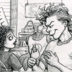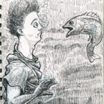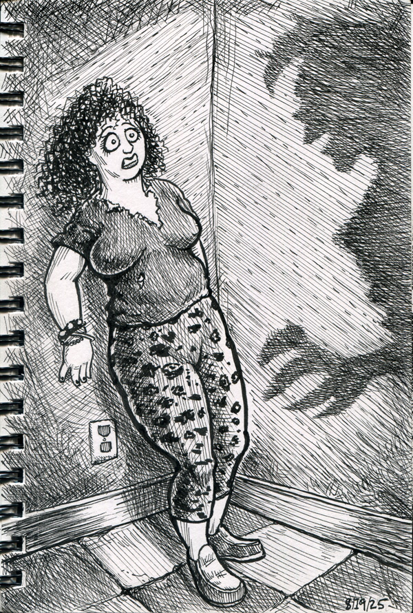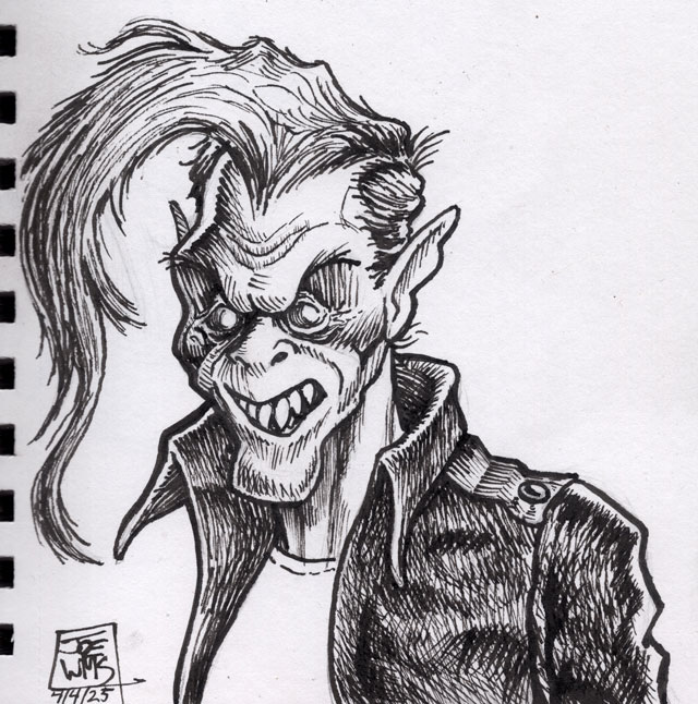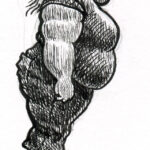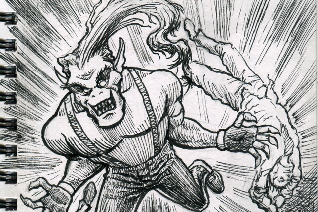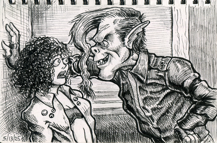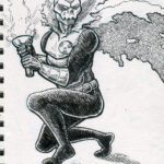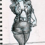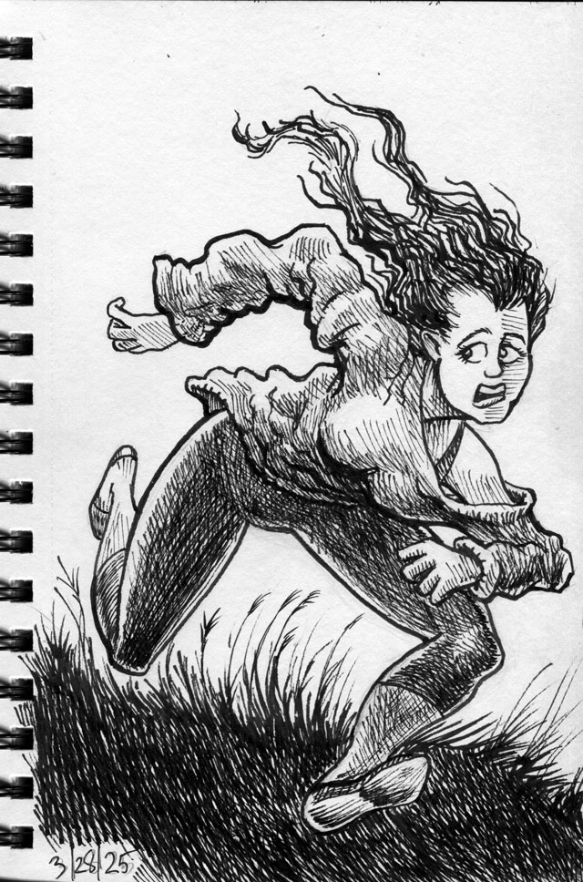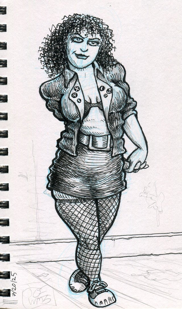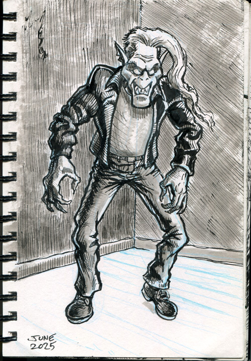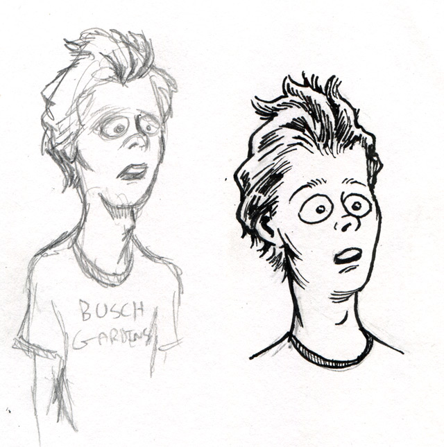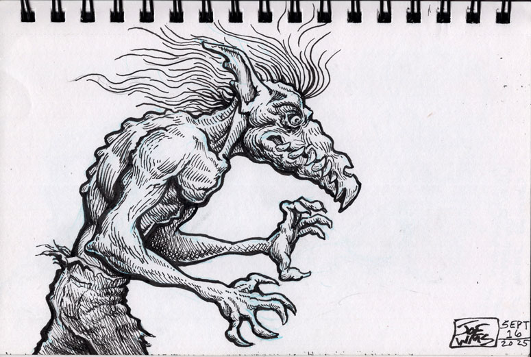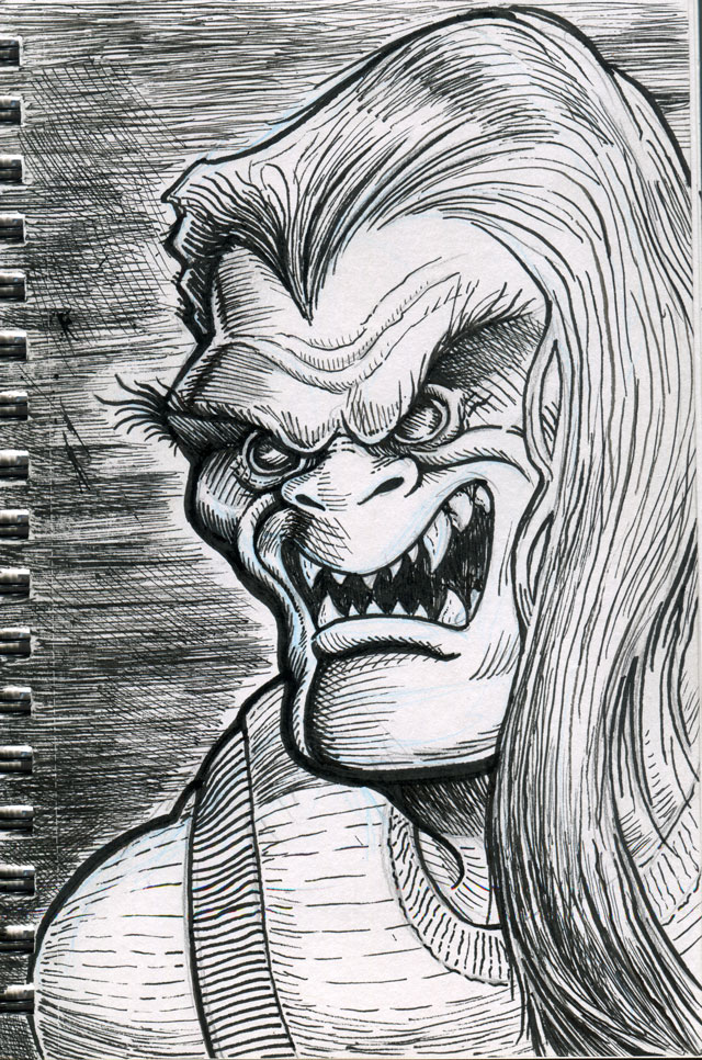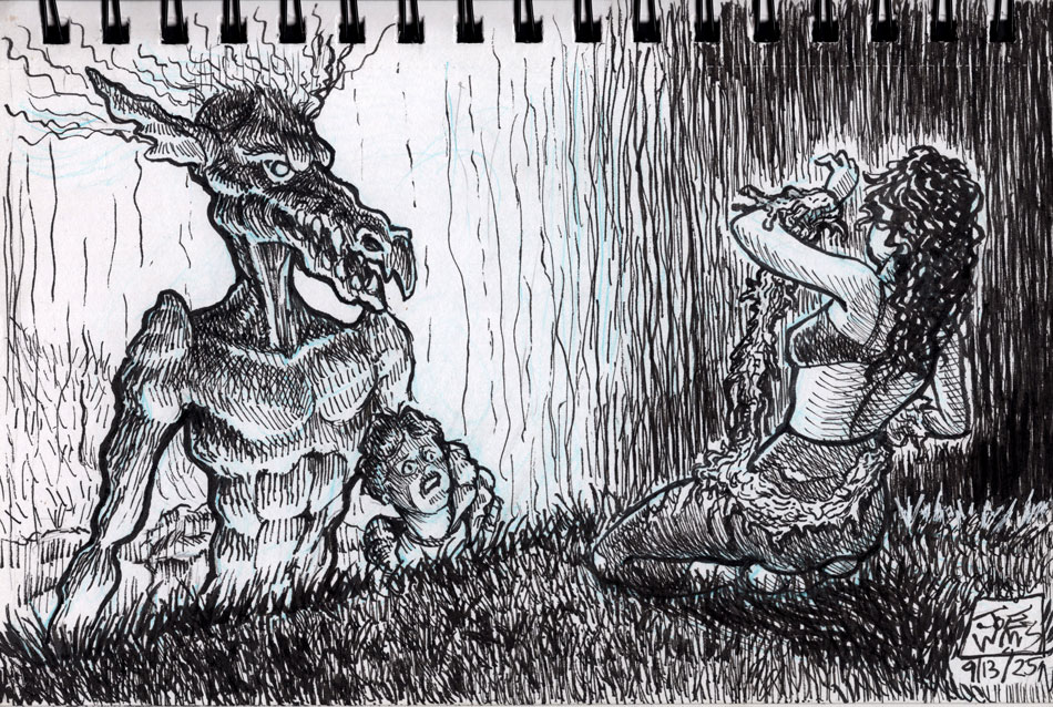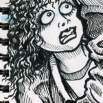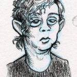 The first three drawings are a miscellany, and the rest all have to do with The Teenage Beast story. I placed the Beast drawings in the order in which they occur in the story. It sort of helps me as a story board would. I am still in the process of doing a hand-written outline and the drawings expand upon what I have written. I’m also working out what the characters look like and having a lot of fun. Inking is weirdly relaxing.