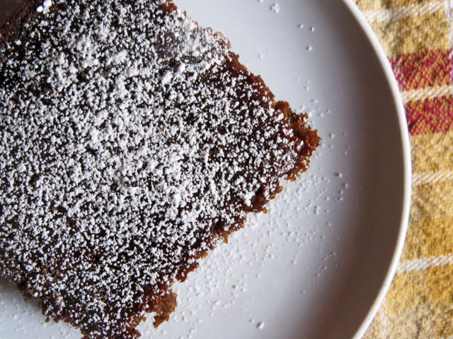 Gingerbread feels like a fall type of snacking cake. No butter or eggs needed, pretty much everything you need to make this cake is already in your pantry. Top it off with a dusting of confectioners sugar, and you’ve done!