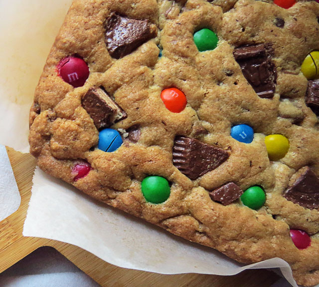 - Fold in 1 cup of a mixture of candy bars and M&Ms. Evenly press dough into prepared pan. Top with remainder of the candy, gently pressing into the dough. Bake for 30 to 35 minutes, testing with a toothpick.