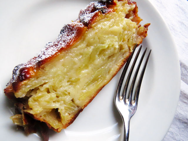 This is an invisible apple cake. Invisible because the apples are sliced so thin, that when they’re baked with the custardy batter, they seem to disappear into the cake. It’s more fruit than cake, and absolutely delicious – what will the French think of next?