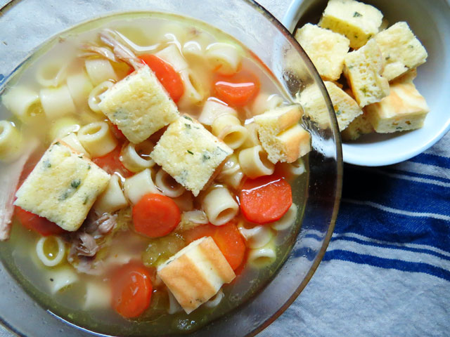 Post Thanksgiving, when we’ve had our fill of turkey sandwiches – there’s turkey soup with carrots, celery, and ditalini. This year, I switched it up and made these Italian soup squares. They’re very simple to make – eggs, flour, baking powder, parsley, and Parmigiana whisked together and spread out in a pan and baked. Basically, they’re like breadless croutons that garnish your soup. The soup squares sop up the broth, like soft pillows – they’re delicious!